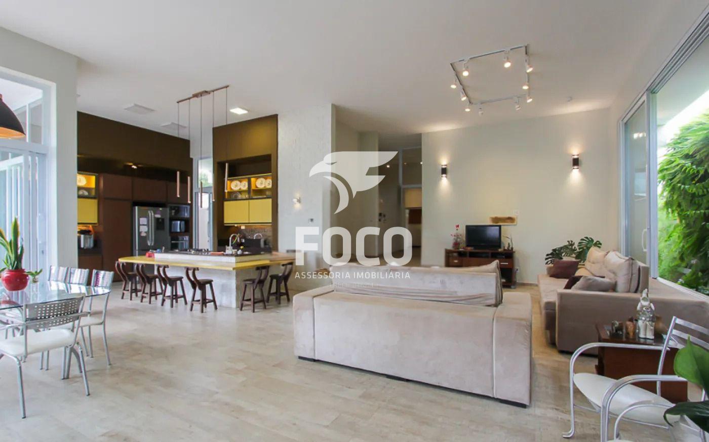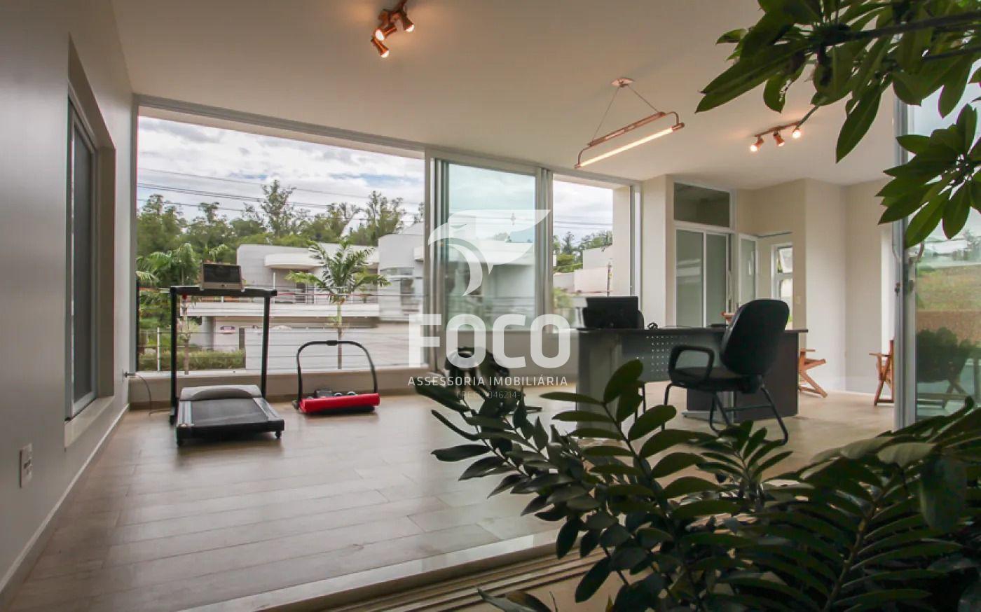 A sala é integrada à cozinha e à sala de jantar. Na parte frontal há um bloco multiuso, atualmente utilizado como escritório, sala de estar e espaço com esteira. Nesse mesmo setor ficam parte da piscina coberta, o lavabo e a sauna elétrica.