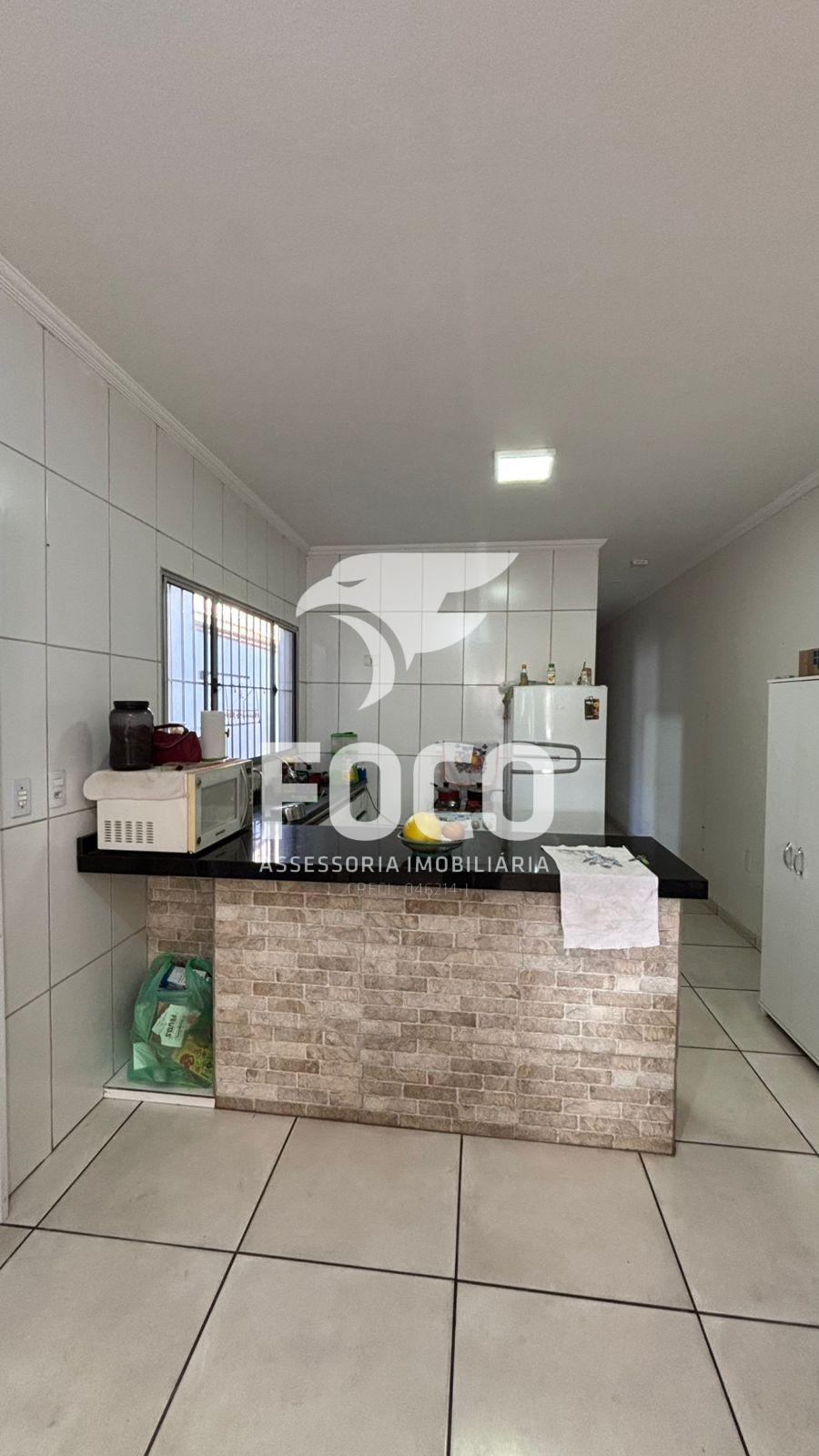 Casa contendo garagem coberta para 2 veículos, sala de estar integrada a cozinha com armários, lavanderia e 2 dormitórios sendo 1 suíte e armário.